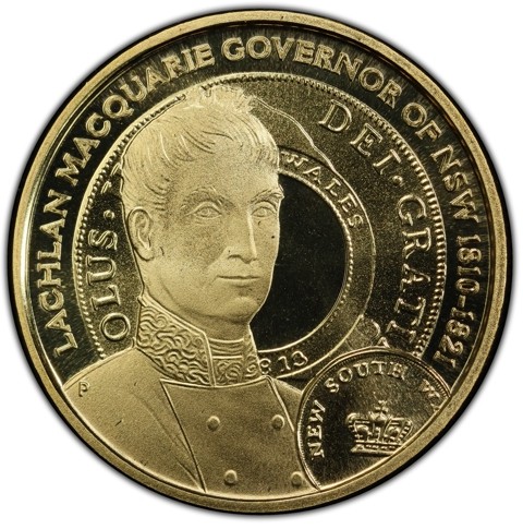 The coin’s reverse features Governor Macquarie's portrait surrounded by inscription "LACHLAN MACQUARIE GOVERNOR OF NSW" above, a five-shilling holey dollar in the background and a 15 pence dump below right the image. These were Australia's first coinage made from Spanish silver dollars. In the left field , the Perth Mint “P” mintmark on Macquarie's shoulder.