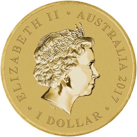 Fourth crowned portrait of HM Queen Elizabeth II facing right, wearing the Girls of Great Britain and Ireland tiara. surrounded by the inscriptions “ELIZABETH II,” “AUSTRALIA, 2017,” and the face value “1 DOLLAR.”