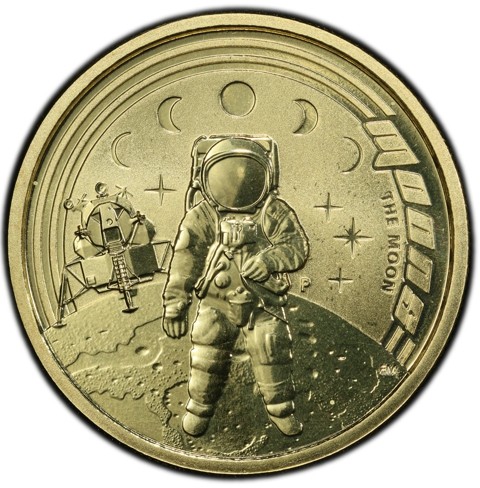 The reverse features Neil A. Armstrong walking on the moon with the Lunar Module Eagle behind him and Stars in the background. Above him the moon phases from left to right new crescent, waning crescent, full moon, waxing crescent. At the right inscription identify theme "moons". In the right below field , the Perth Mint “P” mintmark below the Astronaut's elbow and the designer's initials (EM) appears below right.