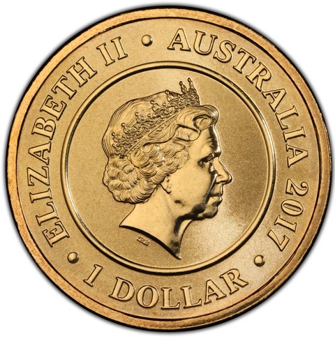 Fourth crowned portrait of HM Queen Elizabeth II facing right, wearing the Girls of Great Britain and Ireland tiara within a circle surrounded by the inscriptions “ELIZABETH II,” “AUSTRALIA, 2017,” and the face value “1 DOLLAR.”