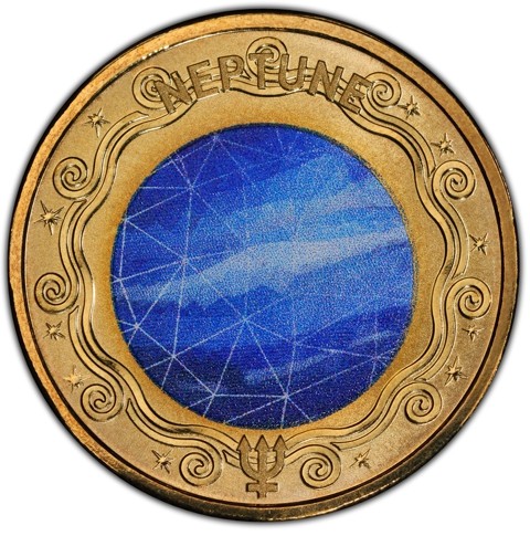The reverse showcases a deep-blue, colored image of Neptune, with swirling atmospheric bands and delicate geometric star-map lines across its surface. Surrounding the central insert is an ornate golden ring decorated with flowing swirl motifs, small stars, curved astral ornaments, and the inscription NEPTUNE at the top. At the bottom appears the trident symbol, referencing the Roman god whose name the planet bears.
