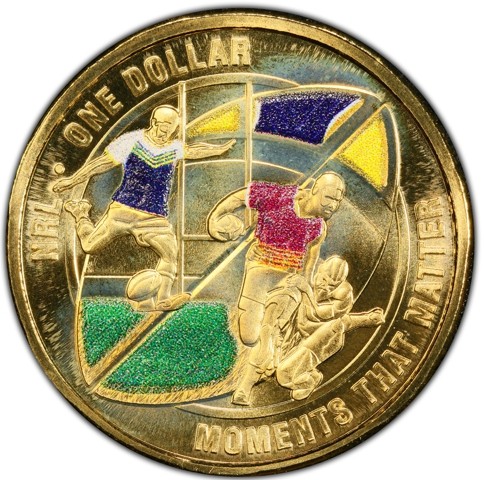 Coin’s reverse features an artistic representation of on-field action, showcasing heart-stopping moments that matter, this piece embodies the spectacular tries, courageous defense and the brilliant skills, depicts rugby football player from Canterbury-Bankstown FC kicking and other from Brisbane FC striving to get the ball during the game. The background is shaped as a colored Rugby League Football and Goalposts are seen behind the players. The inscription and denomination "NRL . ONE DOLLAR" above left and "MOMENTS THAT MATTER" at the opposite. The S(for Sydney) mint mark of the Royal Australian Mint above.