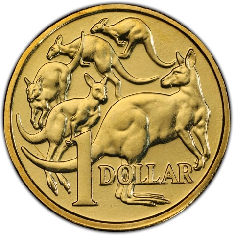 The reverse depicts five kangaroos (known as the Mob of Roos), the closest facing right but looking to left. Below, and overlaid on them, the denomination and face value "1 DOLLAR."