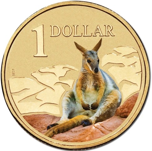 The reverse coin depicts multi-colored yellow-footed rock-wallaby (Petrogale xanthopus), formerly known as the ring-tailed rock-wallaby standing on rocky outcrop, facing right; denomination and face value above. In the left field, The design includes the artist’s signature (SII).