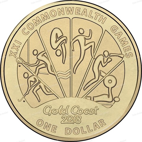The reverse design is divided into six sectors by rays radiating out from the Gold Coast 2018 below. In each sector, there is a pictogram representation of one of the sports played at the games: hockey, tennis, diving, athletics, boxing, and para powerlifting. The inscription identify theme "XXI COMMONWEALTH GAMES" around above and the face value in capital letters "ONE DOLLAR" around below.