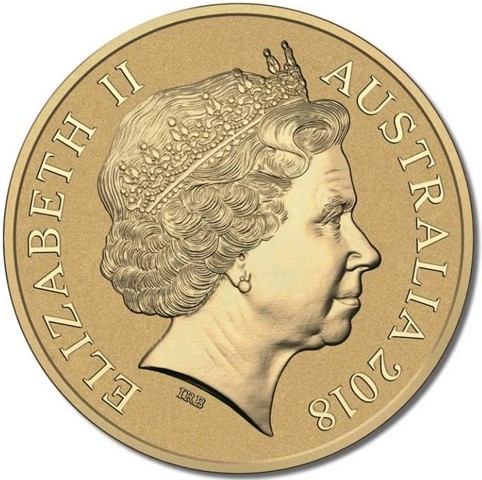 Fourth crowned portrait of HM Queen Elizabeth II facing right, wearing the Girls of Great Britain and Ireland tiara within a circle surrounded by the inscriptions “ELIZABETH II,” “AUSTRALIA, 2018,” and the face value “1 DOLLAR.”
