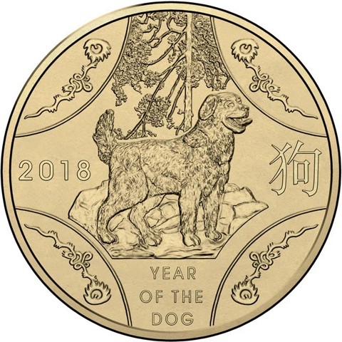On the reverse, the design presents a beautifully detailed design of a dog stands alert with its head raised and mouth slightly open with its tongue extended, conveying confidence and guardianship standing on rocky terrain below a leafy tree. Around the central figure incorporates Chrissy Lau’s traditional Chinese design decorative panels containing floral ornaments. The inscriptions include “2018” above and in three lines “YEAR OF THE DOG" below. At the right, the Chinese character (狗) for “Dog.”