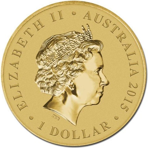 Fourth crowned portrait of HM Queen Elizabeth II facing right, wearing the Girls of Great Britain and Ireland tiara. surrounded by the inscriptions “ELIZABETH II,” “AUSTRALIA,2015,” and the face value “1 DOLLAR.”