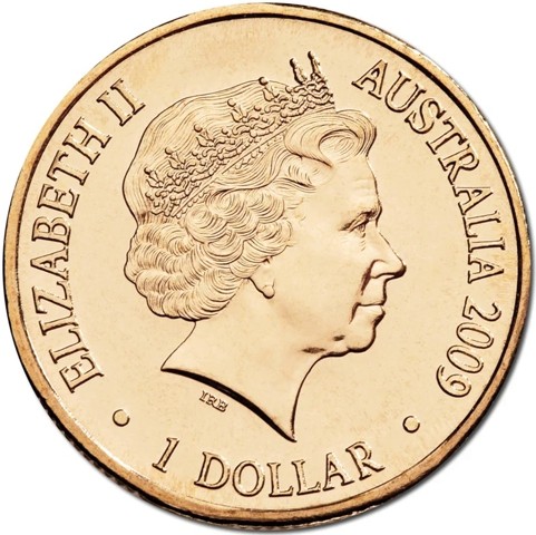 Fourth crowned portrait of HM Queen Elizabeth II facing right, wearing the Girls of Great Britain and Ireland tiara. surrounded by the inscriptions “ELIZABETH II,” “AUSTRALIA,2009,” and the face value “1 DOLLAR.”