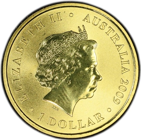 Fourth crowned portrait of HM Queen Elizabeth II facing right, wearing the Girls of Great Britain and Ireland tiara. surrounded by the inscriptions “ELIZABETH II,” “AUSTRALIA, 2009,” and the face value “1 DOLLAR.”