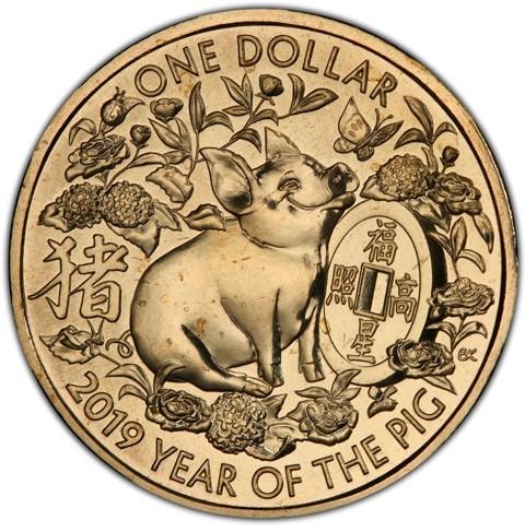 The coin's reverse depicts the auspicious nature of the Year of the Pig with a happy, optimistic pig surrounded by lucky hydrangea blooms holding a lucky Chinese coin representing Fu, or Happiness and to left of it Chinese (猪) character for Pig. the inscription "2019 YEAR OF THE PIG" is inscribed close to the bottom rim and face value "ONE DOLLAR" around above. The designer's initials "BK" in tiny letters at the right side.