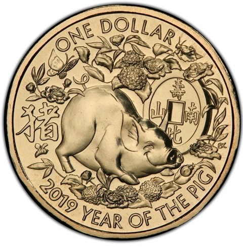 The coin's reverse depicts the auspicious nature of the Year of the Pig with a happy, optimistic pig surrounded by lucky hydrangea blooms holding a lucky Chinese coin representing Shòu, or Longevity and to left of it Chinese (猪) character for Pig. the inscription "2019 YEAR OF THE PIG" is inscribed close to the bottom rim. The designer's initials "BK" in tiny letters at the right side.