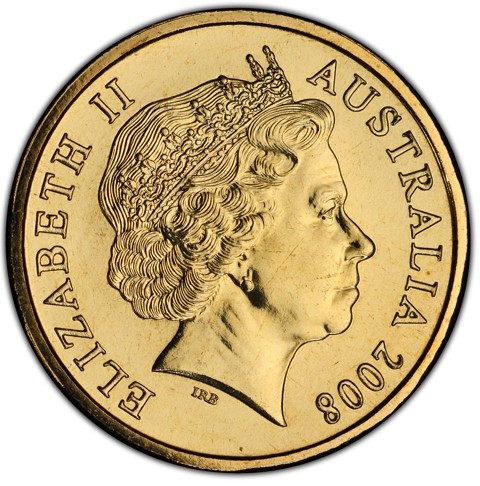 Fourth crowned portrait of HM Queen Elizabeth II facing right, wearing the Girls of Great Britain and Ireland tiara. surrounded by the inscriptions “ELIZABETH II,” “AUSTRALIA, 2008,” and the face value “1 DOLLAR.”
