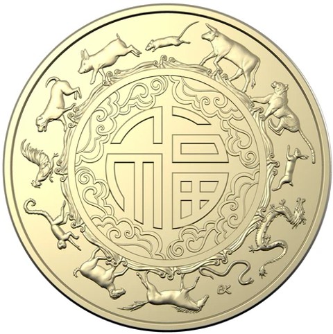 The reverse of the coin features the symbol for Fu "福" (happiness) surrounded by a lunar calendar wheel, will notice that each of the 12 animals in the cycle is represented in the design of the wheel. At the very top of the wheel, indicating it is the animal represented for the year, is a small rat. The designer's initials (BK) are below left.