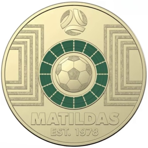 The reverse design features a circle of the a dark green colored, one of the first colors sport kits of Matildas surrounding the football, surrounded by a stylized penalty area on both sides, the Socceroos logo (2018–present)above and on two lines below, the inscription "MATILDAS EST. 1978."