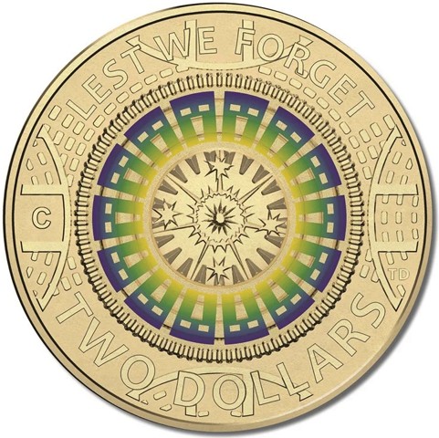 The reverse of the coin depicts the Interior of the Hall of Memory dome. From the base of the dome, stylized hands deliver the souls of the dead through clouds and dark blue sky to heaven. The spirits are symbolized by simplified, winged coffins in shapes that suggest Egyptian mummies. From a central spiritual sun, over which the stars of the Southern Cross are superimposed, seven shafts of light radiate to the cornice (the lower rim of the dome) and symbolize the seven-pointed star of Australia. The legend at the top of the coin reads "LEST WE FORGET" and the bottom shows the denomination "TWO DOLLARS." The designer's initials (TD) are in the right field.