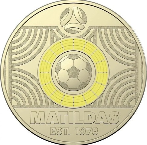 The reverse design features a circle of a yellow color, one of the first colors sport kits of Matildas surrounding the football within a center of the stadium field, the Socceroos logo (2018–present)above and on two lines below the inscription "MATILDAS EST. 1978."