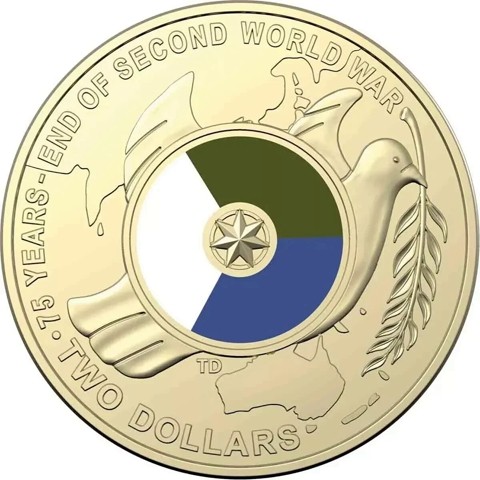 The design of this coin reflects the hope for peace as well as remembrance for those who died, with four design elements: a map of the Asia-Pacific region, a dove, which has become an international symbol of peace. In its beak, the bird is carrying an olive branch, a band of colors that representative of the three Australian military forces; the Australian Army (green), the Royal Australian Navy (blue) and the Royal Australian Air Force (white), which operated during the Second World War, a seven-pointed star for the Commonwealth and also for the stars that were displayed on Mother’s and Widow’s badges. The legend around above left of the coin reads "75 YEARS - END OF SECOND WORLD WAR" and the bottom shows the denomination "TWO DOLLARS." The designer's initials (TD) are below the circle.