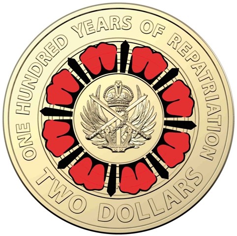 a unique interpretation of the First World War ‘Returned from Active Service’ badge (The design of the bronze WWI badge portrays a combined Royal Australian Navy (RAN) anchor, Australian Imperial Force (AIF) rising sun, and Royal Australian Air Force (RAAF) wings, surmounted by St Edward’s Crown) is framed by a circular color print depicting black arrows in between red and black petals. The arrows are inspired by the iconic Rising Sun, which is representative of the journey home undertaken by Australian service personnel over the last 100 years. While the petals represent the Flanders Field poppy; an iconic symbol of war remembrance, with each petal symbolizing each of the six states and two territories of Australia. The designer's initials ‘AWB’ can be viewed under the painted arrow in the 6 o’clock position, towards the outer edge of the inner ring. The legend at the top of the coin reads "ONE HUNDRED YEARS OF REPATRIATION