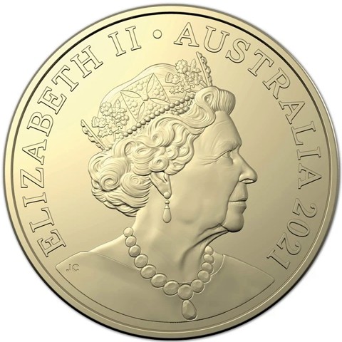 Fourth crowned portrait of HM Queen Elizabeth II facing right, wearing the Girls of Great Britain and Ireland tiara, framed by inscriptions ELIZABETH II, AUSTRALIA and the coin's date of mintage "2021" inscribed below.