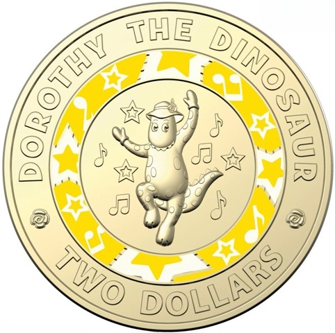 The reverse design shows dancing Dorothy the Dinosaur, a character from The Wiggles children's show, a young friendly green dinosaur. Her skin has big yellow spots and she wears white pleather gloves, and a white floppy leather hat. surrounded by music symbols and stars. Encircling him is a vibrant, yellow ring adorned with music symbols and stars. The legend at the top of the coin, his name, "DOROTHY THE DINOSAUR" and the bottom shows the denomination "TWO DOLLARS" divided by two roses, those adorned with her hat.