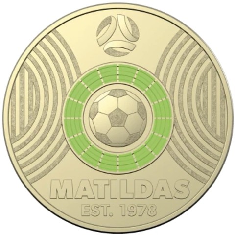 The reverse design features a circle of the a dark green colored, one of the first colors sport kits of Matildas surrounding the football, surrounded by stylized center circles on both sides, the Socceroos logo (2018–present)above and on two lines below, the inscription "MATILDAS EST. 1978."