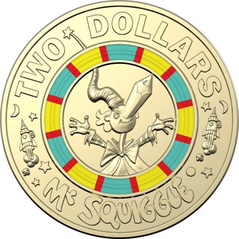 The reverse design shows Mr. Squiggle, a main character from the ABC children's show, who is pencil-nosed and blue-haired. Encircling him is a vibrant, multi-colored (predominantly green and yellow) ring with two rockets, small stars and a small crescent Moon in the outer ring. The legend at the bottom of the coin reads "MR SQUIGGLE" and the top shows the denomination "TWO DOLLARS."