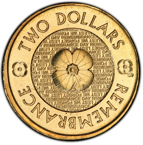 The reverse feature a poppy design surrounded by the words Lest we forget and Remembrance Day in repetitive micro-lettering. The legend at the bottom of the coin reads "REMEMBRANCE" and the top shows the denomination "TWO DOLLARS."