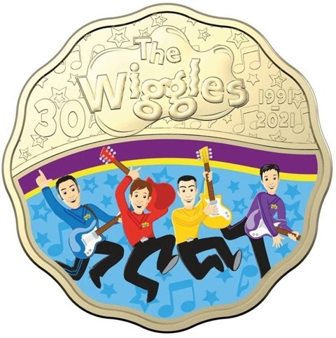 The reverse, the lower part is colored and depicts a cartoon representation of the popular children's entertainment group The Wiggles, playing their guitars. Above center, the logo of The Wiggles. To the right of that on three lines, dates year of beginning 1991 and year of issue 2021., to the left of the logo, the numeral face value (30).