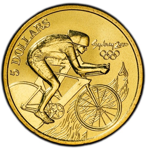 The reverse presents a powerful image of a male professional bike rider riding his bike with strength and determination. He wears a cycling helmet and sunglasses, and the dynamic posture emphasizes strength and athletic mastery, while a flowing curved Olympic flame symbolizes movement and artistry in the background. Above, the Sydney 2000 logo (hosted city rises above the five Olympic rings).The denomination“5 DOLLARS” curves along the upper left edge.