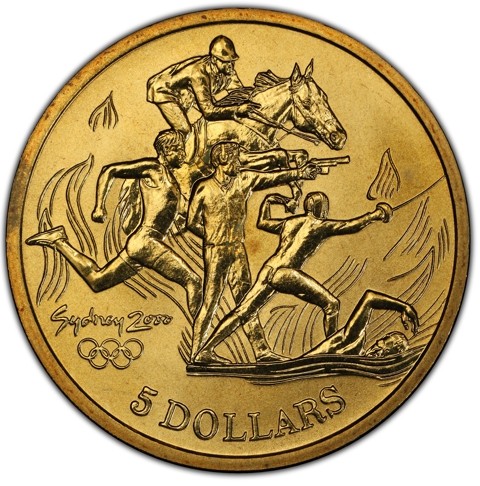 The reverse showcases five athletes captured in action, performing dynamic movements, each figure finely detailed one game of Modern Pentathlon Equestrian, Runner, Shooter, Fencer, and Swimmer against a flowing curved Olympic flame symbolizes movement and artistry in the background. On the below left, the Sydney 2000 logo (hosted city rises above the five Olympic rings).The denomination“5 DOLLARS” curves along the bottom edge.