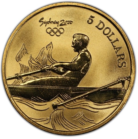 The reverse depicts a side close up view of a well-muscled sweep rower in an eight oared shell during rowing across lake against a flowing curved Olympic flame symbolizes movement and artistry in the background. Above the image, the Sydney 2000 logo (hosted city rises above the five Olympic rings).The denomination“5 DOLLARS” curves along the upper right edge.
