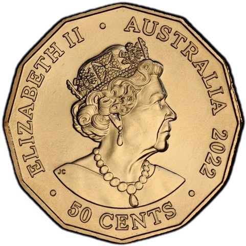 6th crowned portrait of HM Queen Elizabeth II facing right (the Commonwealth effigy), wearing the George IV State Diadem, the Coronation Necklace and Earrings framed by inscriptions “ELIZABETH II,” “AUSTRALIA, 2022” the denomination “50 CENTS.”