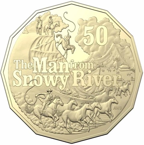 The reverse design shows idyllic landscapes from rural Australia, with "jackaroos" (known as "cowboys") riding and driving horses, and a farm in the background. The face value 50 is above right. On two lines at center, the inscription The Man from Snowy River. The designer's initials (AWB) are below right.
