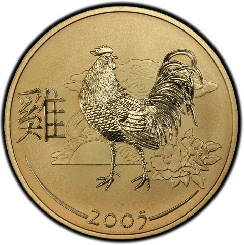 The reverse presents a proud rooster standing on the ground, with finely engraved plumage, strong legs, and an upright crest. The rooster itself has proof-like qualities but the background design has a matte finish. Behind it appear stylized clouds and flowering plants, adding balance and elegance to the scene. To the left is the Chinese character (雞) for “Rooster,” while the year 2005 below and the Perth Mint's mark, "P," is not included.