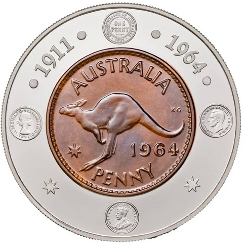 The reverse design shows the reverse of penny (Commonwealth Star and Kangaroo. Coins minted at Melbourne had a dot at the end of the word PENNY, while coins from Perth did not have a dot) surrounding by four coin images. They are the 1911 penny the first date of Australian Pennies and portraits of King George V, King George VI and Queen Elizabeth II with dates year of first edition and year of finishing above and two Commonwealth Stars below.