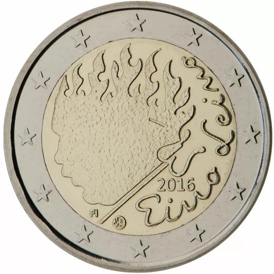 A flame, and a poker pointing upwards to the right. The inscription ‘EINO LEINO’, in semi-circle and the year of issue are placed at the right. At the bottom left is the indication of the issuing country ‘FI’ and the mint mark. The coin’s outer ring bears the 12 stars of the European Union.