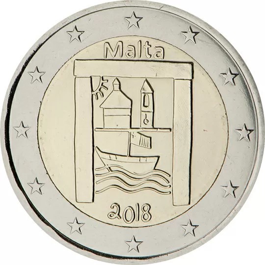 Created by a school student and depicts a variety of themes intrinsic to Maltese heritage including: an allusion to the prehistoric temples, which are the world’s oldest free-standing structures, a church dome and spire, which is a characteristic feature of the Maltese town and village skyline and a representation of a traditional Maltese boat carrying a Maltese flag. The name of the issuing country ‘Malta’ is at the top of the inner circle of the coin and the year ‘2018’ at the bottom. The coin’s outer ring bears the 12 stars of the European Union.