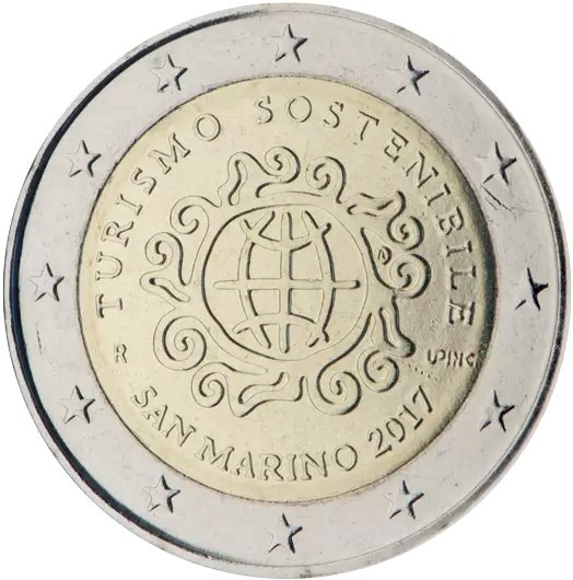 Planet Earth surrounded by waves; to the right a circle with the letter A, symbol of the designer Andrew Lewis. Arched, above the writing “TURISMO SOSTENIBILE”, below “SAN MARINO” and the year of issue; to the right the initials of the engraver Uliana Pernazza “UP INC.”; to the left the letter “R” of the Italian Mint which took care of the mintage.