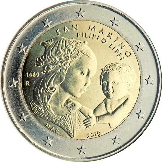 Madonna and Child, a detail from Filippo Lippi’s ‘Madonna and Child with Two Angels’; above are the inscriptions ‘SAN MARINO’ and ‘FILIPPO LIPPI’ and on the left are the year ‘1469’ and the letter ‘R’ identifying the Mint of Rome. On the bottom left are the initials of the artist Maria Angela Cassol ‘M.A.C.’, and in the centre the year ‘2019’. The coin’s outer ring bears the 12 stars of the European flag.