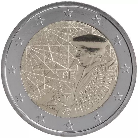 Mix of two major elements of the Erasmus programme: the original intellectual inspiration, Erasmus himself, and the allegory of its influence over Europe. The first one is symbolized by one of the most known depictions of Erasmus. The second one is symbolized by a beam of links going across the coin from a beacon to another, representing the numerous intellectual and human exchanges between the European students. As a reference to Europe, some of these links form other stars, born from the synergy between the countries. The figure 35, for 35th anniversary comes out from the stars in a contemporary graphical style. The coin’s outer ring bears the 12 stars of the European flag.