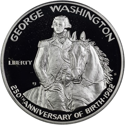 The obverse of the coin portrays George Washington on horseback. The inscriptions read “George Washington”, “Liberty”, “250th Anniversary of Birth” and the date “1982”.