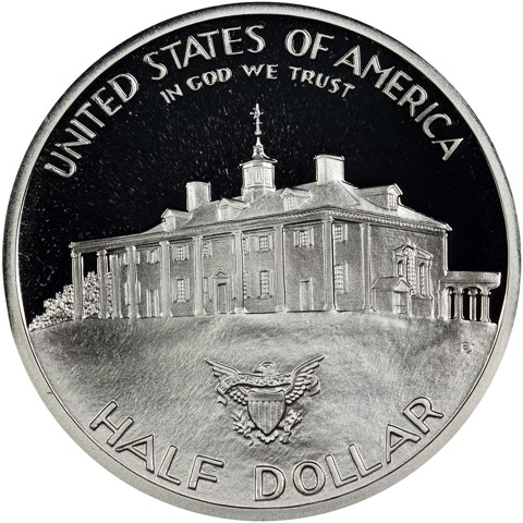 The reverse features the eastern façade of Washington’s home at Mount Vernon, with a heraldic eagle appearing below. The inscriptions include “United States of America”, “In God We Trust”, and the denomination “Half Dollar”.