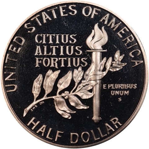 On the reverse of the coin is an image of the Olympic torch and an olive branch. The inscriptions above and below read “United States of America” and “Half Dollar”. A central inscription reads “Citius Altius Fortius” which is Latin for “Faster, Higher, Stronger”.