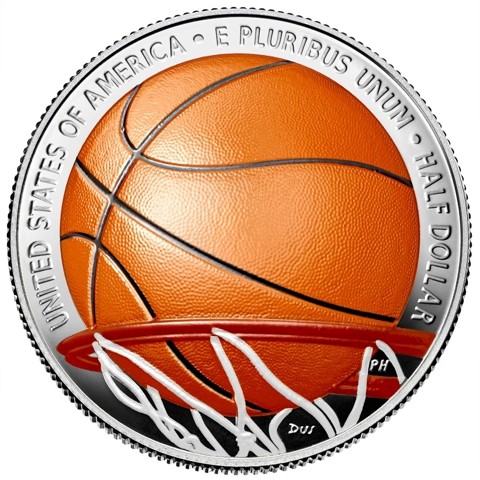 The Colorized reverse design depicts a basketball about to pass through the net.
