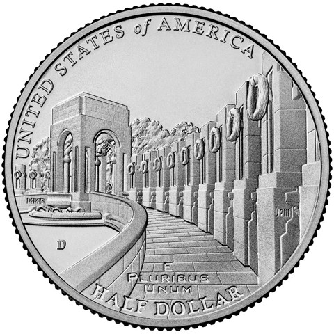 The reverse depicts the World War II Memorial from the point of view of a person walking up a ramp leading to one of the towers.
