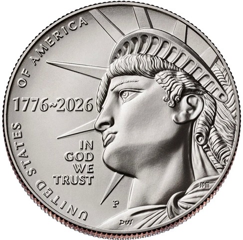 The obverse shows the close-up of side view of a bust of the Statue of Liberty. Around the left side the country name, UNITED STATES OF AMERICA is partly obscured by the rays of Liberty's diadem. In the left, the dates "1776 ~ 2026". on four lines below, inscription IN GOD WE TRUST, below left.