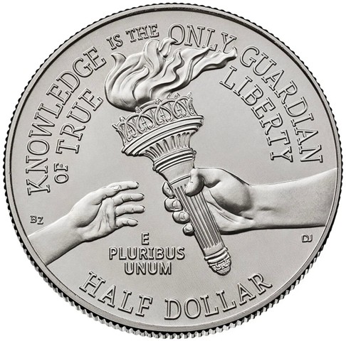 The reverse depicts liberty passing her torch symbolizing the hope and promise of America, it's flame trailing with the momentum of purpose, to a new generation. Above, the inscription in two lines "KNOWLEDGE IS THE ONLY GUARDIAN OF TRUE LIBERTY" and below, inscription E PLURIBUS UNUM. The face value "HALF DOLLAR" at the bottom.