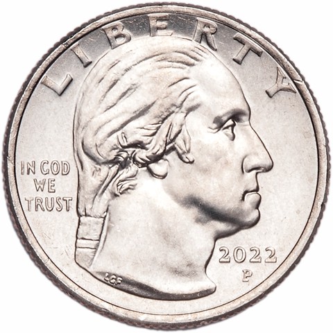 The obverse depicts a portrait of George Washington. This design was originally composed and sculpted by Laura Gardin Fraser as a candidate entry for the 1932 quarter, which honored the bicentennial of George Washington’s birth. Inscriptions are “LIBERTY,” “IN GOD WE TRUST,” and “2022.”