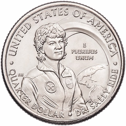 The design depicts Dr. Sally Ride next to a window on the space shuttle, inspired by her quote, “But when I wasn’t working, I was usually at a window looking down at Earth.” The inscription “E PLURIBUS UNUM” is intentionally positioned over the Earth next to America, indicating that out of all women in the United States, Dr. Ride was the first into space. The additional inscriptions are “UNITED STATES OF AMERICA,” “QUARTER DOLLAR,” and “DR. SALLY RIDE.”